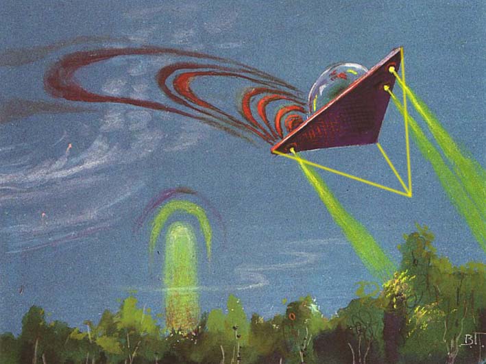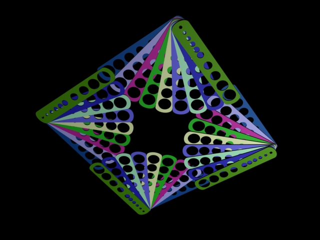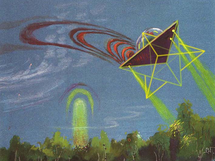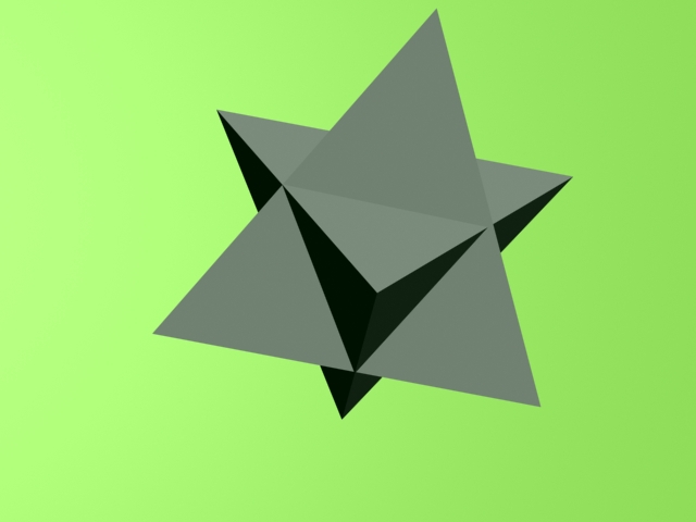 Вовчик поднял интересную тему с треугольным летящим объектом, который изображен у ГВС, со своей кочки я расмотрел это вот так, см. ZIP2. Применяя конформное отображение получившегося тетраэдра с инверсией (по Золотареву) получился звездчатчатый октаэдр. Если задать вращение тетраэдрам во взаимно противоположных направлениях, то получим по общей оси ВИХРЬ.