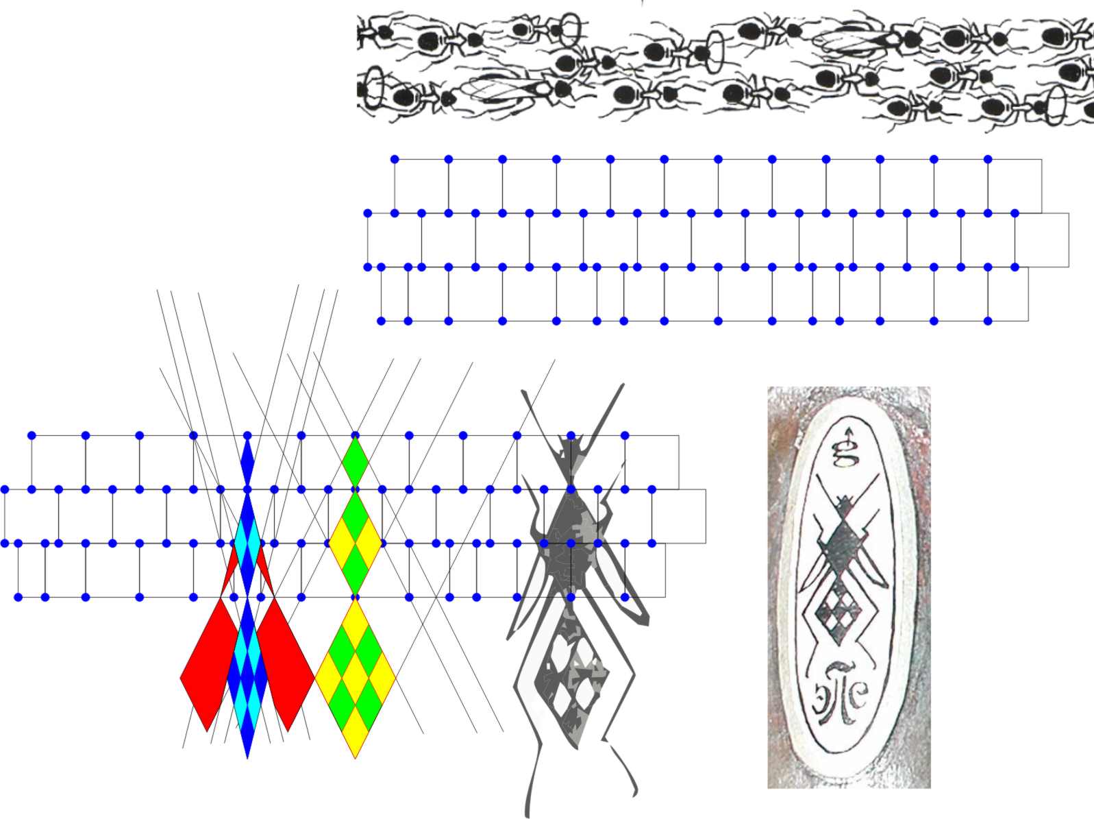 Я разбирал в свое время эти рисунки. Точки у меня тоже синие были:), перенес их на сетки, только ты пучности в виде яиц упустил. См. ниже. Я могу доказать и на твоем рисунке о фазовости информационной составляющей ЭПС. Виноваты в этом мерцающие/вращающиеся электроны в виде синих точек:). Для этого нужно удобней с "конформном" сесть в кресло и представить изображенных муравьев с точками в виде кинопленки. Делаем кадрирующую рамку, для того чтобы сконцентрировать свой взгляд на одном кадре. Запускаем эту пленку с определенной скоростью (время пошло), но в кадре картинка, смазана. Вводим задержку (пульсацию) на адоптацию глаза. И что мы видим? А видим мы девиацию (модуляцию по фазе) мерцающих синих точек. Ширина пленки у нас не меняется, амплитуда стабильна, скорость пленки стабильна, пульсация стабильна, длина пленки стабильна. ОТКУДА информация, чего электроны мерцают? ОТТУДА НОГИ РАСТУТ :) ОТ ФАЗЫ. В интерферометре то, засекли сдвиг фаз ВдБ движущихся элементарных частиц. А пленка у нас движется. Вот такая муравьиная кристаллическая решетка получается, с ВдБ. Полная инверсия. :P